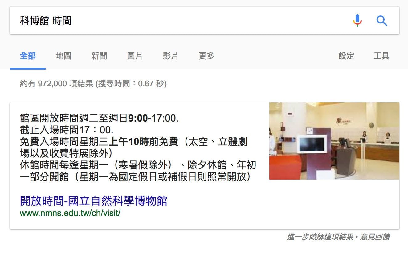 其實Google fun facts不只是實用好玩,在做SEO網站排名、網站維護的時候,這可是讓你排在搜尋引擎第一名的機會。其實類似的功能中文叫做「搜尋結果中的精選摘要」,例如想要知道台中科博館開放到幾點、什麼時候公休,只要搜尋科博館時間,就會出現